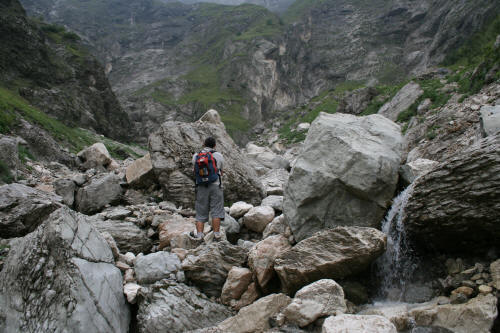 | Si sale ancora dentro l'enorme canale detritico sotto la muraglia del monte Camicia dal quale scendono cascate che al solo sguardo mettono i brividi i cui nomi conosciamo solo dalla loro fama: Infinita, Requiem e Dies Irae. Posto sacro dell'alpinismo e del torrentismo sul Gran Sasso. |