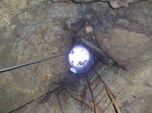 | Ecco come si presenta all'apertura della botola l'ingresso della cavità. La scala di ferro non sembra molto solida... |