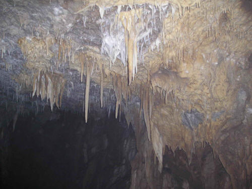 | Ancora un immagine del soffitto della prima sala, molto concrezionato. La giornata si conclude così... purtroppo i diversi tentativi di trovare una prosecuzione non hanno avuto fin qui esiti positivi e l'assenza di correnti d'aria non promette molto bene. Tuttavia questa grotta si colloca all'interno di un sistema carsico potenzialmente buono, per cui auguriamo al Gruppo Grotte Piceno un buon lavoro di esplorazione in tutta quella zona! |