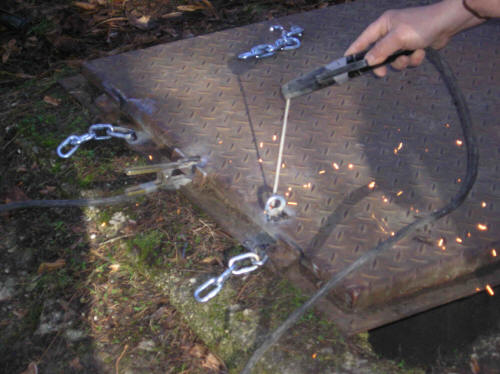 | Dopo aver dissaldato la botola vengono posizionati i nuovi anelli per la chiusura stavolta con lucchetti. |