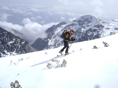 | Il vallone del Palombaro, passo dopo passo, superando le solite note valanghe di canale, ti porta in alto fino alla vetta del Martellese a quota 2259, popolata dai pini mughi ricoperti di neve. |